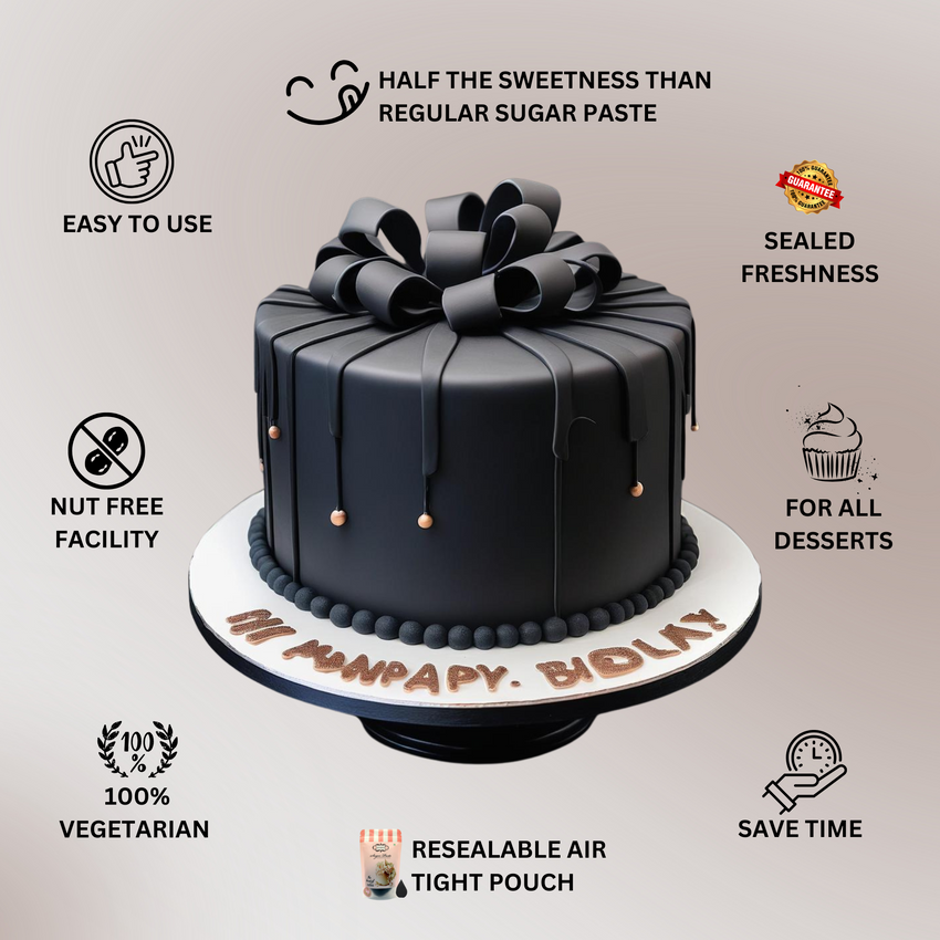 Soft, non-sticky and pliable texture, easy to roll, mouldable and stretchable, crack-free finish, no potato starch, diabetic-friendly. Perfect for covering cakes or creating decorations like bows, drapes, borders, and toppers.