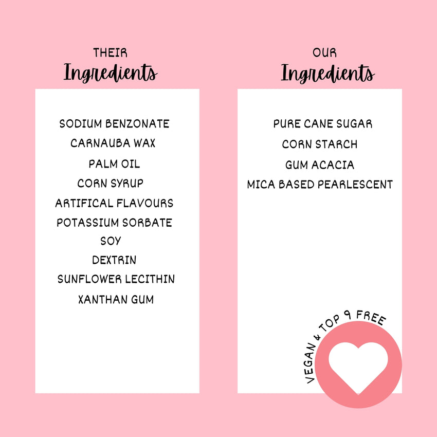 Sugar, Glucose Syrup, Corn Starch, Cocoa Solids, Food-Grade Colors & Flavours, Vegetable Shortening, Gum Arabic, Permitted Additives.
