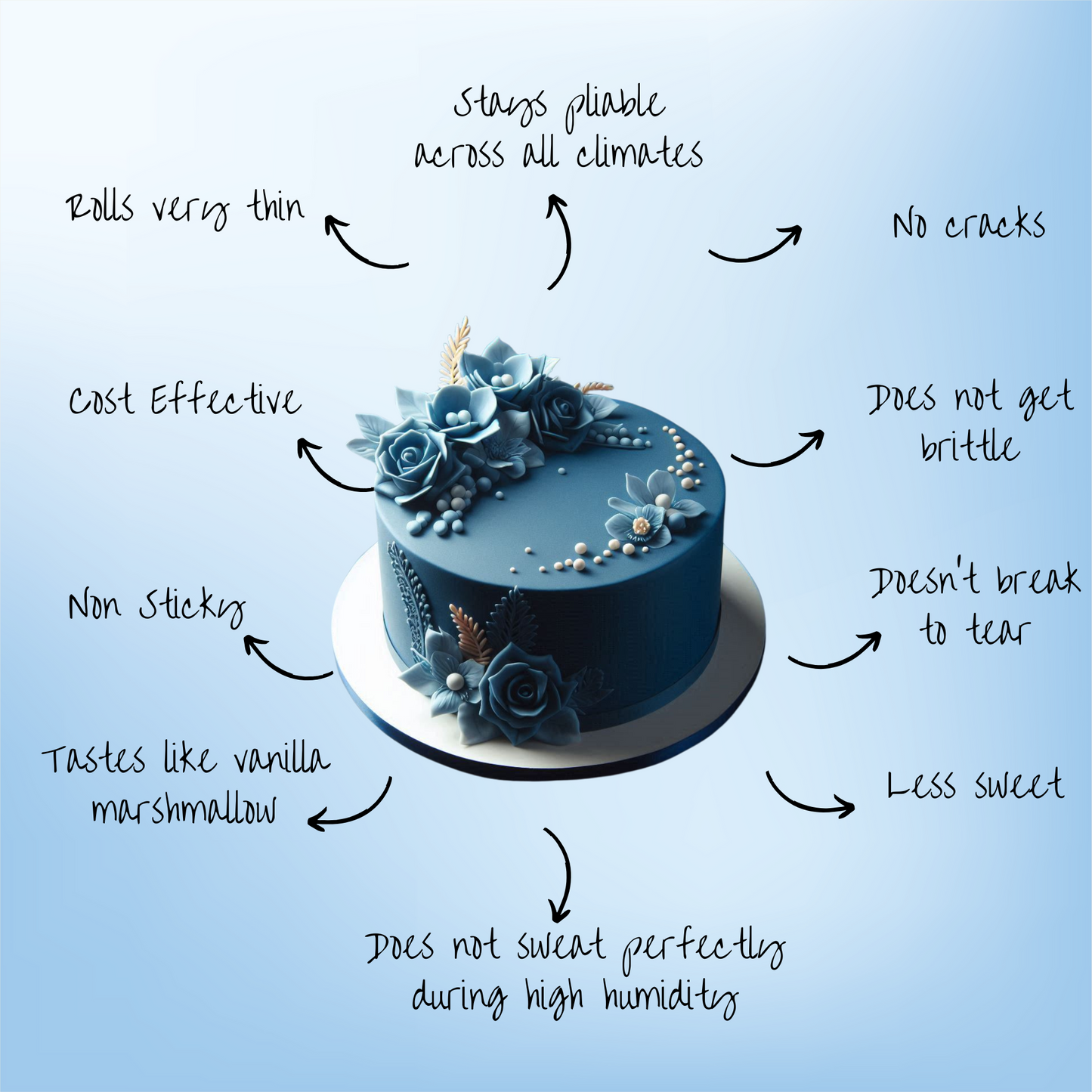 Soft, non-sticky and pliable texture, easy to roll, mouldable and stretchable, crack-free finish, no potato starch, diabetic-friendly. Perfect for covering cakes or creating decorations like bows, drapes, borders, and toppers.