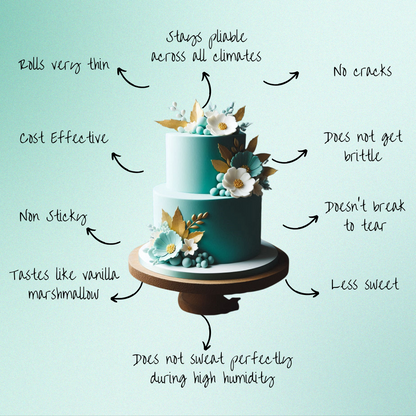 Soft, non-sticky and pliable texture, easy to roll, mouldable and stretchable, crack-free finish, no potato starch, diabetic-friendly. Perfect for covering cakes or creating decorations like bows, drapes, borders, and toppers.