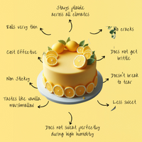 Soft, non-sticky and pliable texture, easy to roll, mouldable and stretchable, crack-free finish, no potato starch, diabetic-friendly. Perfect for covering cakes or creating decorations like bows, drapes, borders, and toppers.