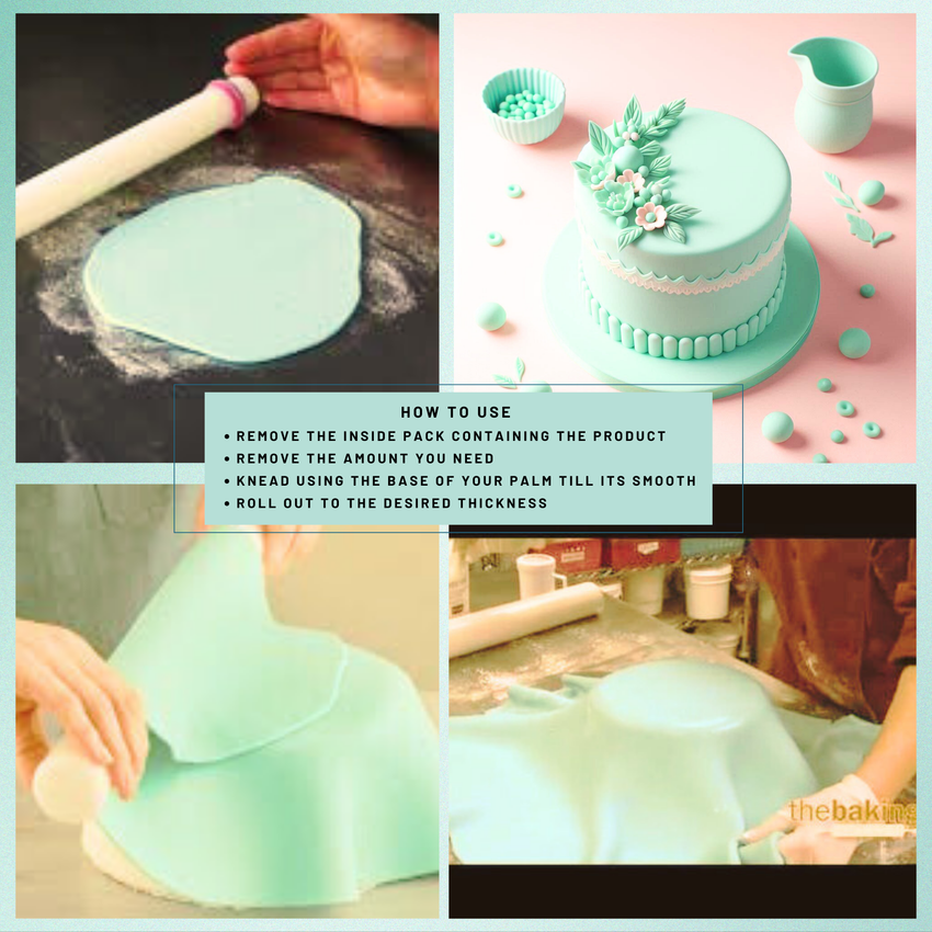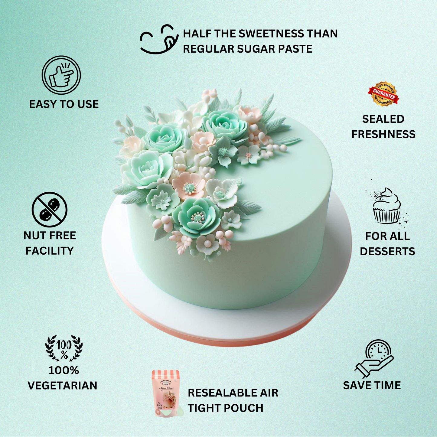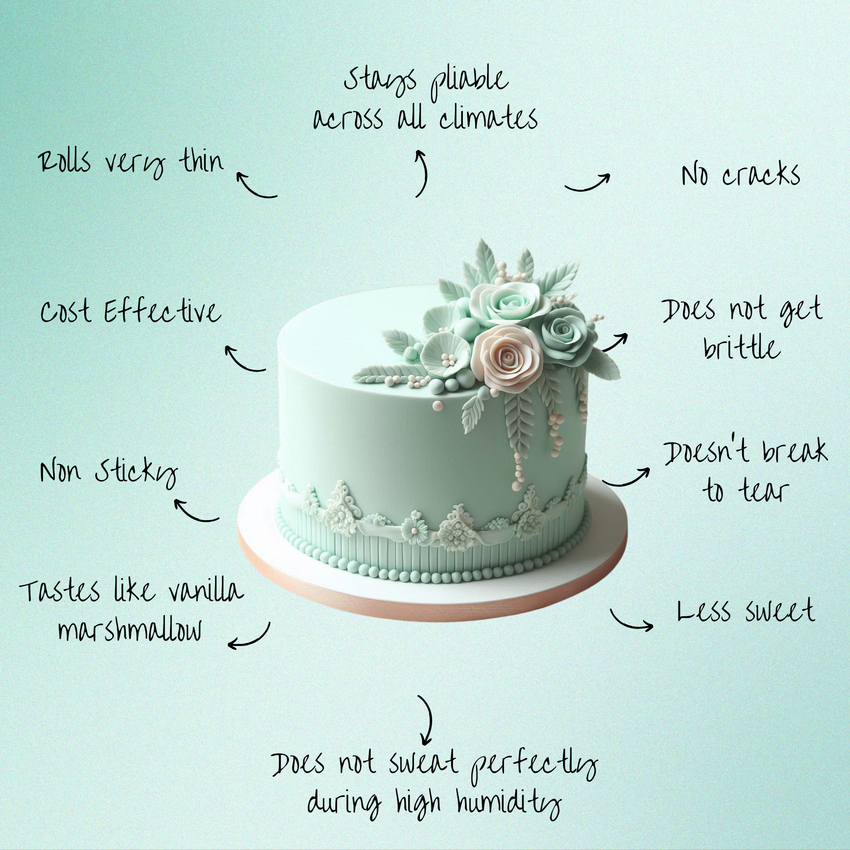 Soft, non-sticky and pliable texture, easy to roll, mouldable and stretchable, crack-free finish, no potato starch, diabetic-friendly. Perfect for covering cakes or creating decorations like bows, drapes, borders, and toppers.