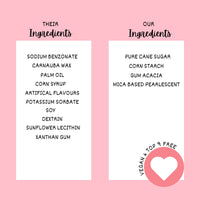 Sugar, Glucose Syrup, Corn Starch, Cocoa Solids, Food-Grade Colors & Flavours, Vegetable Shortening, Gum Arabic, Permitted Additives.