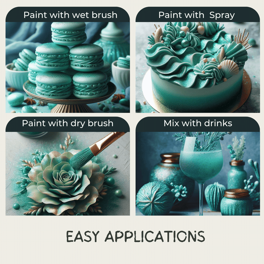 Apply dry with a soft brush for subtle shimmer. Use stencils for precise designs. Works on fondant, gum paste, chocolate, and buttercream. Store in airtight container away from moisture.